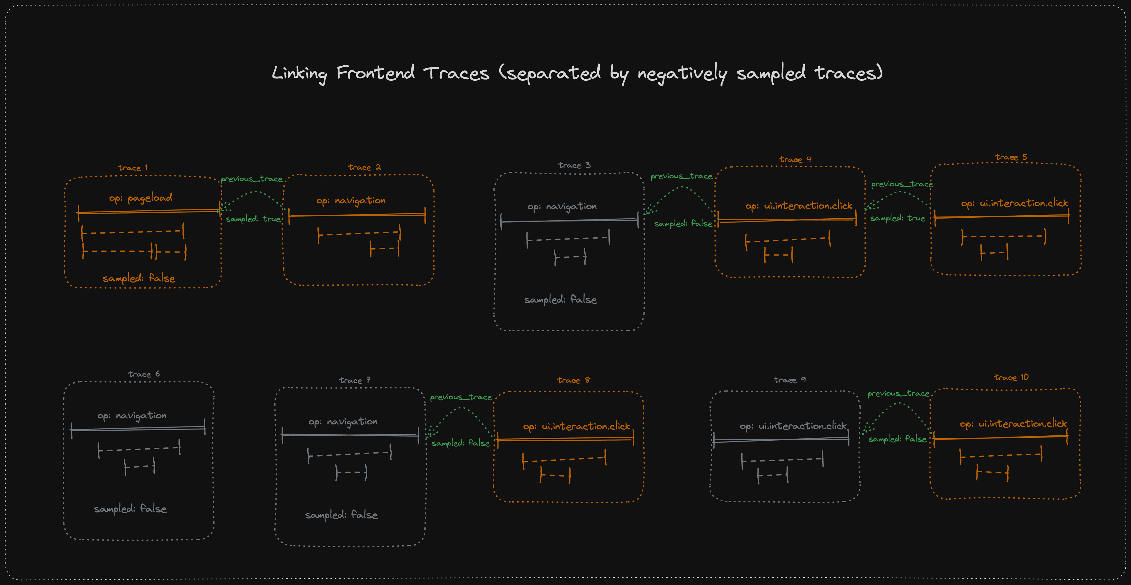 Frontend traces can be linked by adding span links between root spans. For example, a navigation span includes a link to the previous page load span.